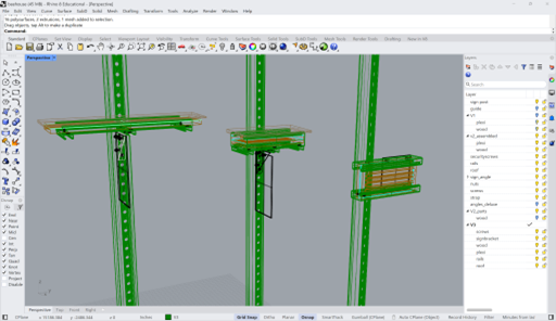Preestablecimos que cada nido contendría dos baldosas; por lo tanto, este parámetro determinó el tamaño y la forma de nuestro diseño. Quise adoptar el enfoque de utilizar la mayor cantidad posible de componentes comerciales estándar, con el fin de reducir la complejidad, minimizar la necesidad de herramientas especializadas y acortar el tiempo de montaje. Básicamente, todo el conjunto debería poder fabricarse utilizando únicamente una sierra tronzadora para metal, un taladro, un macho de roscar, destornilladores y alicates. Ah, y una fresadora para tallar las ranuras en la madera. Mi proveedor de referencia para todo tipo de herrajes es McMaster-Carr, así que diseñé varias iteraciones en Rhino utilizando exclusivamente piezas disponibles en su sitio web. Lo mejor de McMaster es que en su página web disponen de planos CAD y archivos 3D de casi todos sus productos, lo cual resultó ideal para realizar prototipos digitales y probar distintas opciones con gran rapidez.