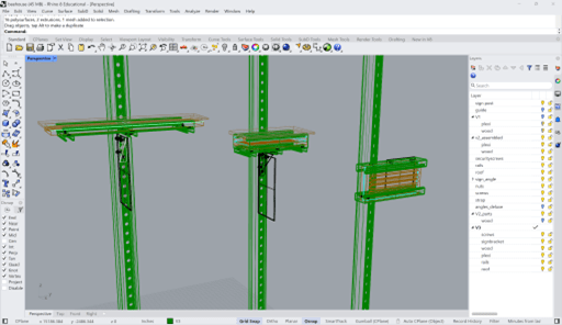 We predetermined that each nest would have 2 tiles in it, so this parameter drove the size and form of our design. I wanted to take the approach of using as much off-the-shelf hardware as possible, to reduce complexity and minimize need for specialty tools and reduce assembly time. This whole thing should basically be able to be made with a metal chop saw, drill, tap, screw drivers, and pliers. Oh, and a router to cut grooves into the wood. My go-to source for all things hardware is McMaster-Carr, so I designed a few iterations in Rhino using only parts available from their website. The nice thing about McMaster is that on their website they have CAD drawings and 3D files of almost all of their products- which was great for quickly